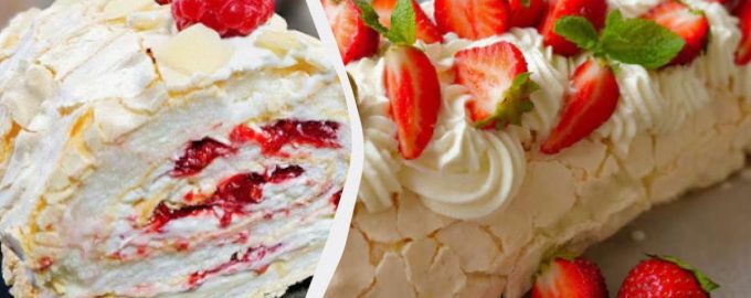 Разпределете крема върху охладената торта и поставете плодовете отгоре. С помощта на пергамента внимателно навийте меренга на руло. Ако кората се напука, не се притеснявайте – тя трябва да се навие. Накрая увийте меренга рулото изцяло в пергамента и го поставете в хладилника за 1-2 часа, за да може кремът да се стабилизира. Охладеният десерт ще бъде готов за сервиране, украсен с плодове, сметана, шоколад, кокосови стърготини или други добавки.